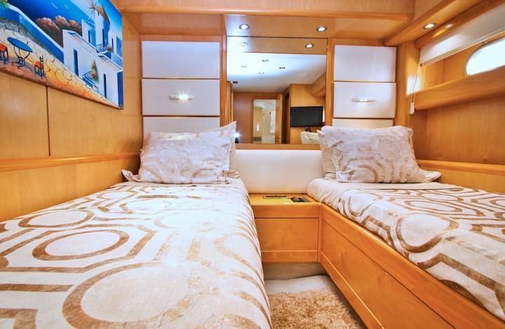 ACCOMMODATION: The Athens private yacht delivers an exceptional seakeeping performance and its spacious Flybridge. On the luxury yacht, you will enjoy generous seating and dining areas on Athens's private yacht charter. Its power to thrill continues on the inside, luxury interior where an unparalleled experience and sense of space awaits you. Beautifully styled throughout, this Athens private yacht blends inviting comfort with cutting edge technology. The spacious main deck of the private yacht with a generous seating area and dining space. With a total length of 62 feet, the Athens private yacht is a leader in its class and continues to set the highest of standards. GUESTS: 6 CREW: 2